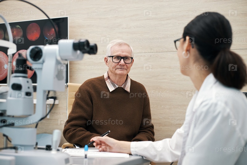 Портрет старшего мужчины, консультирующего женского врача во время осмотра глаз
