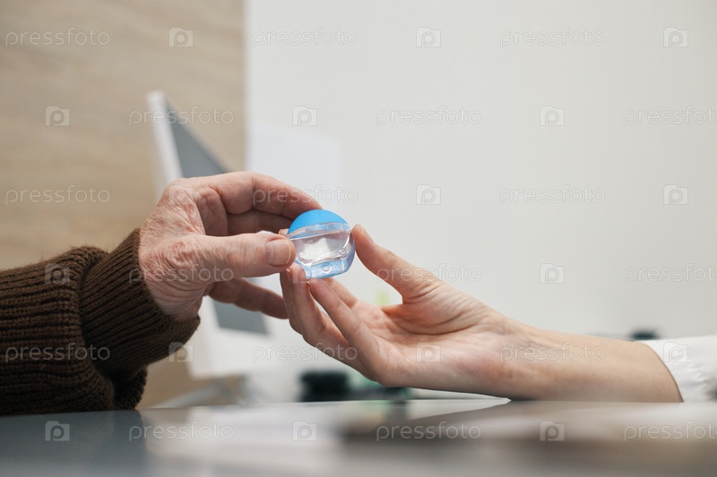 Мужчина получает контейнер с коррекционными линзами от старшего офтальмолога