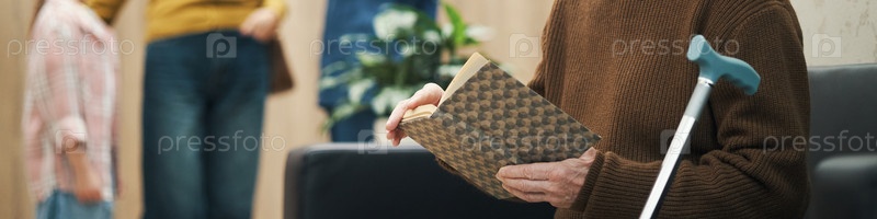 Человек с инвалидностью читает старшую книгу в зоне приемной клиники