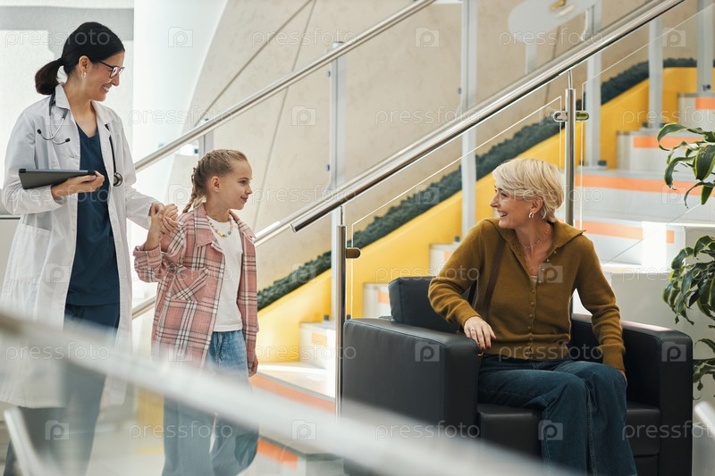 Женщина-врач приветствует улыбающуюся девушку и женщину среднего возраста