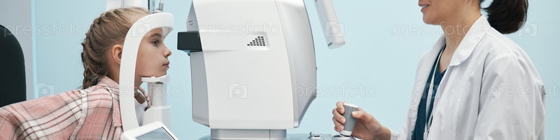 Девушка, проходящая осмотр глаз у врача-женщины с использованием медицинского устройства