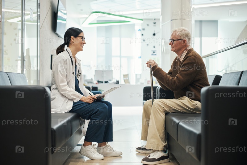 Старший мужчина консультирует женщину-врача, сидя в современной клинике