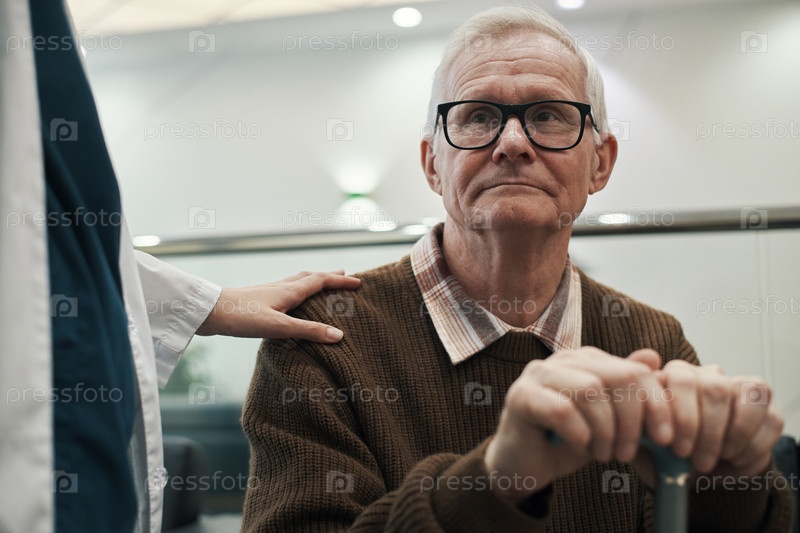 Пожилой мужчина сидит в помещении и получает утешительную поддержку