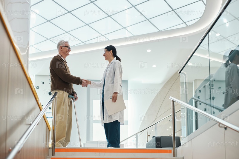 Старший мужчина пожал руку молодой женщине-врачу после назначения