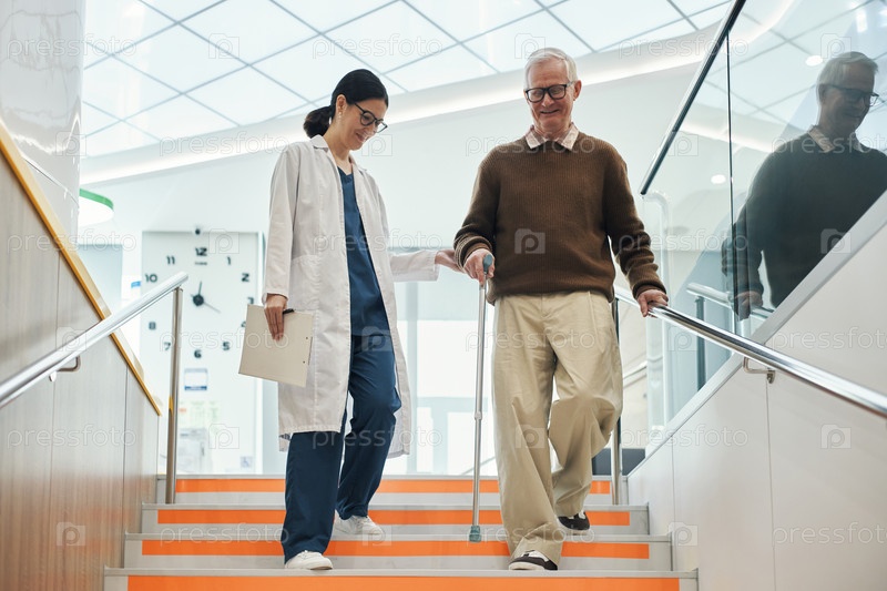 Мужчина использует ходовую трость, спускаясь по лестнице со старшим врачом