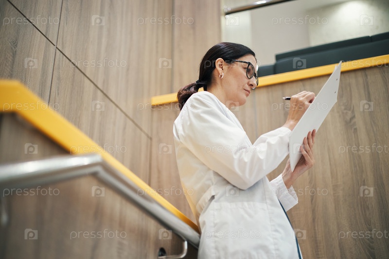 Молодая женщина-врач пишет заметки на доске в коридоре больницы