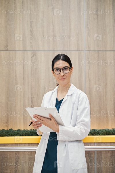 Портрет молодой взрослой женщины-врача, держащей карточку и улыбающейся