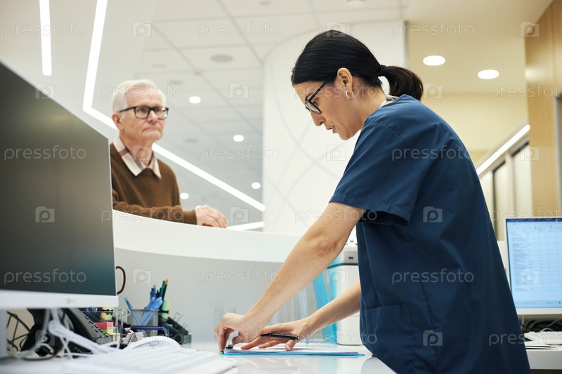 Женщина средних лет, работающая на приеме в медицинской клинике