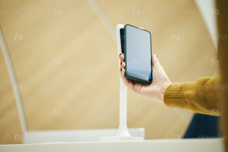 Рука женщины, держащей смартфон возле платежного терминала в помещении