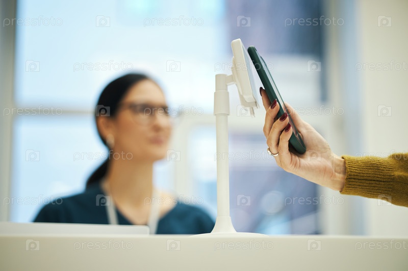 Молодая женщина платит смартфоном в приемной клиники