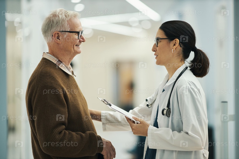 В среднем возрасте женщина-врач консультирует старшего мужчину в больнице