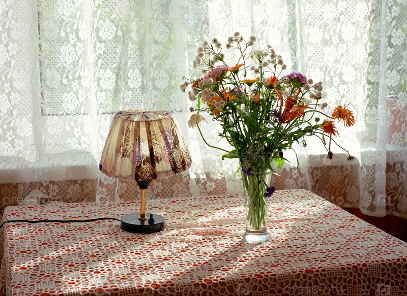 Ваза, удерживающая дикие цветы, стоящие рядом с лампой на кружевном стекле со шнурками