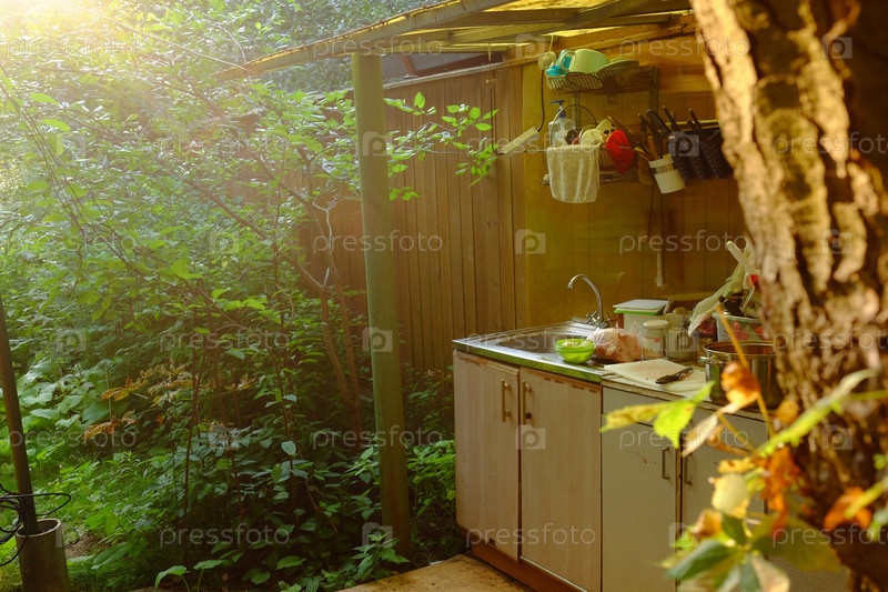 Наружная зона кухонного раковины окружена пышной зеленью в утреннем солнечном свете