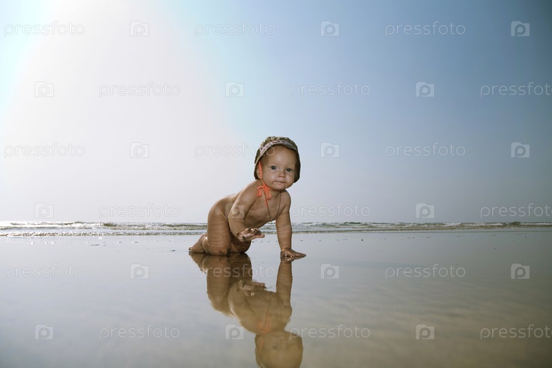 Ребёнок ползет по пляжному песку возле океана под ясным голубым небом