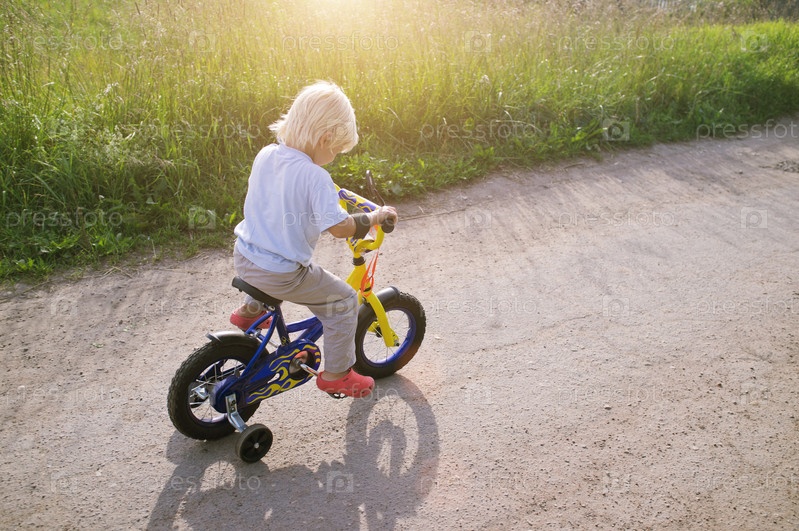 Ребенок ездит на велосипеде с тренировочными колесами На улице под солнцем