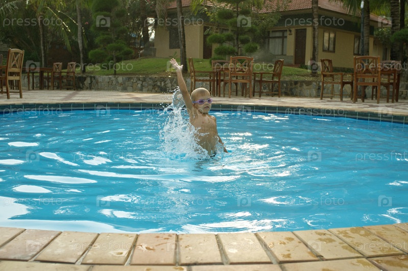 Ребенок плавает в открытом бассейне, брызгая водой с поднятой рукой