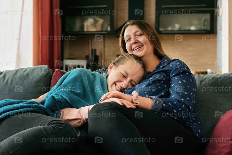 Женщина обнимает смеющуюся девочку-подростка на диване
