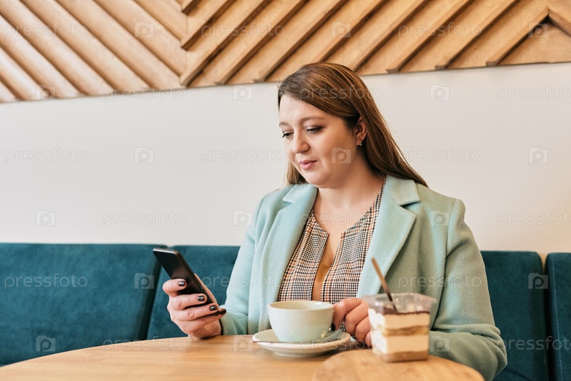 Женщина, сидящая в кафе с помощью смартфона во время отдыха