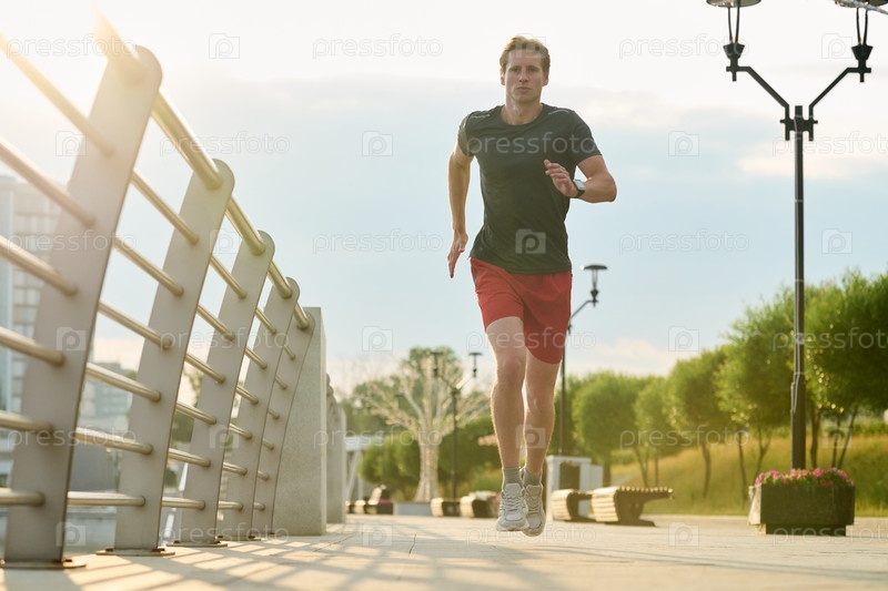 Молодой человек бежит на открытом воздухе вдоль современной городской прогулки