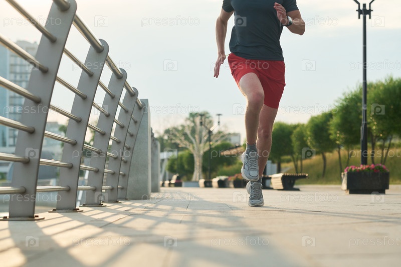 Молодой человек тренируется, бегая по современному городскому тротуару
