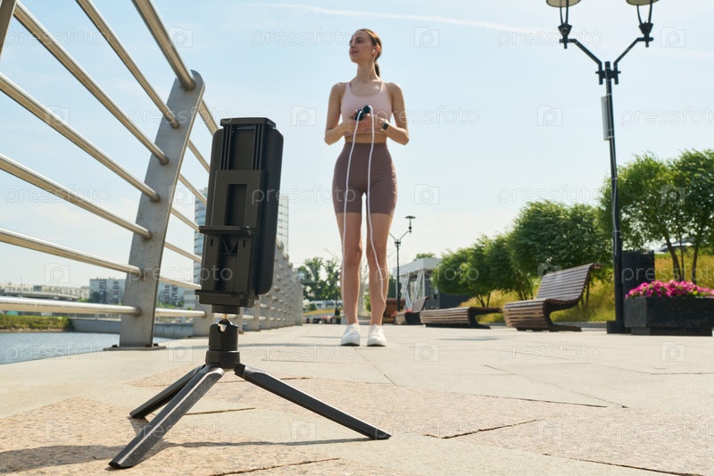 Молодая женщина занимается на открытом воздухе с помощью скакалки возле камеры