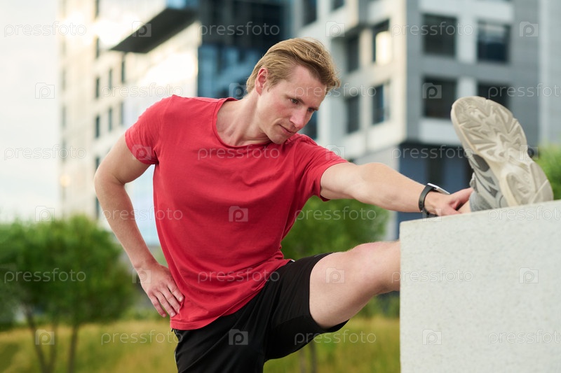 Молодой человек согревается, растягивая ноги на открытом воздухе в городе