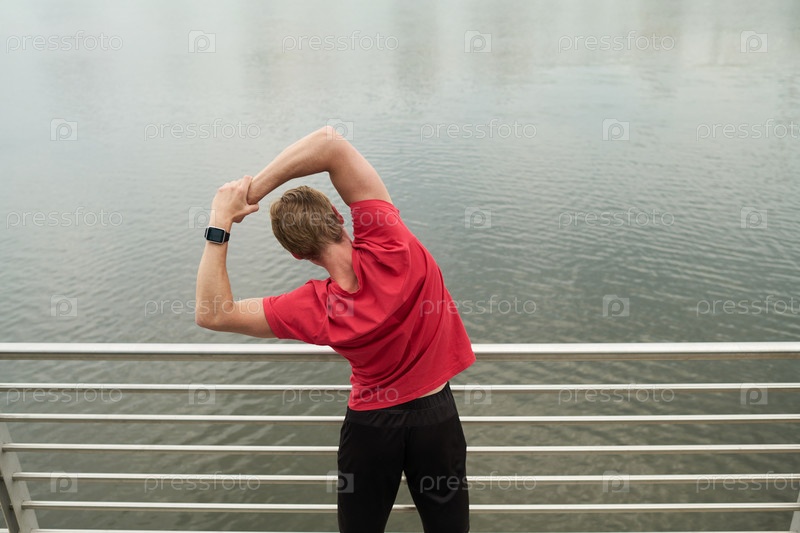 Молодой человек растягивает руки на открытом воздухе возле рельефа на берегу воды