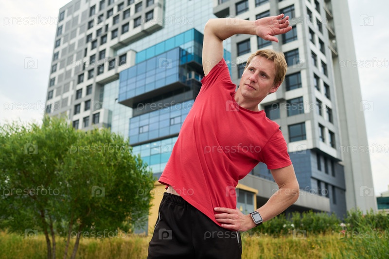 Молодой человек занимается на свежем воздухе возле современного офисного здания