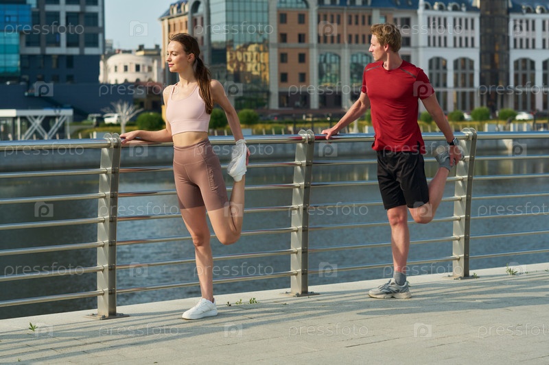 Молодая женщина и мужчина растягивают ноги на открытом воздухе возле городской набережной