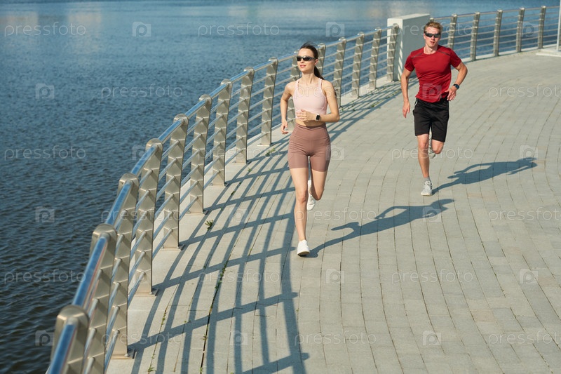 Молодая женщина и молодой человек бегают вдоль прибрежной тропы