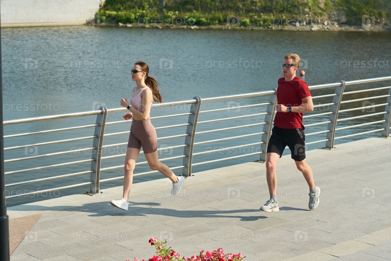 Молодая женщина и молодой мужчина бегут вместе вдоль городской речной promenade