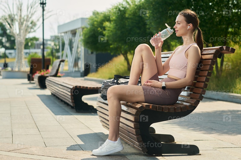 Молодая женщина, отдыхающая на скамейке пьет воду после тренировки на свежем воздухе