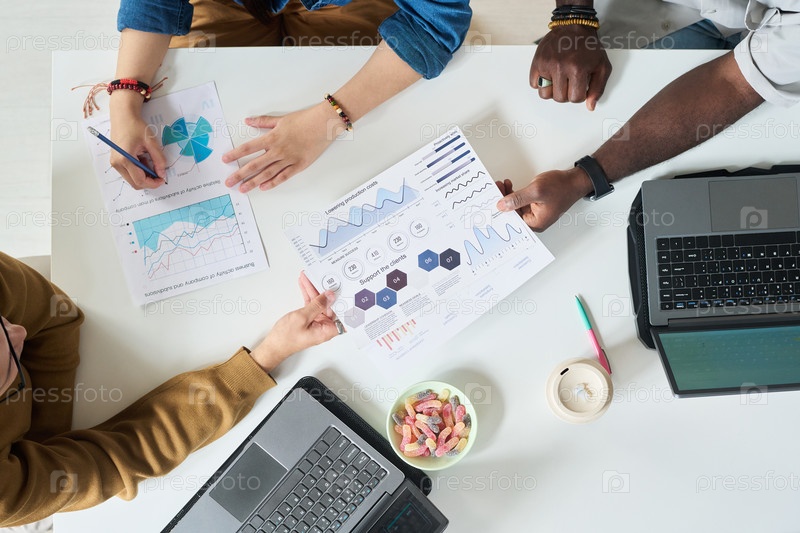 Различные взрослые сотрудничают над бизнес-аналитикой на офисном столе