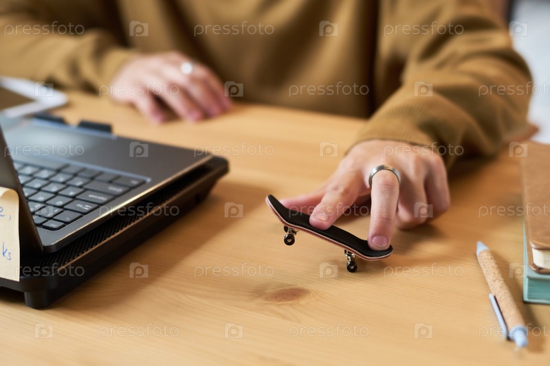 Человек, использующий Fingerboard Skateboard возле Laptop Working