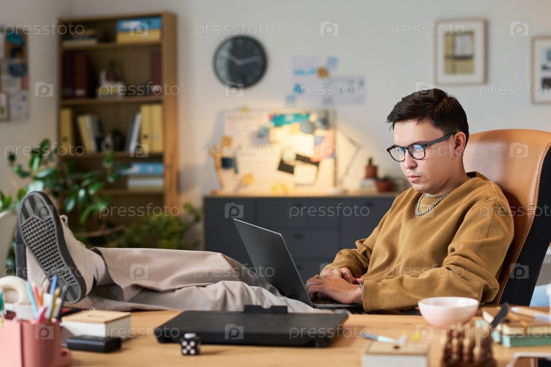 Азиатский мужчина работает на ноутбуке с ногами, отдыхающими на офисном столе