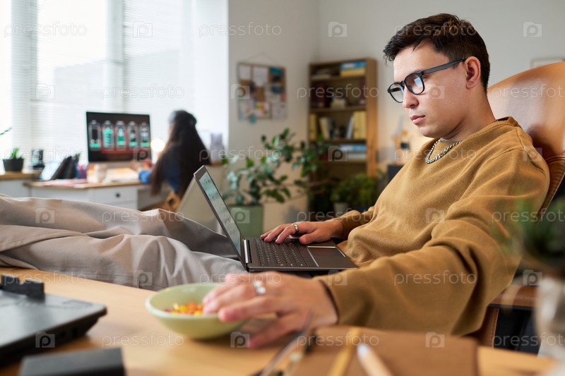 Мужчина работает на ноутбуке, одновременно отдыхая в современном офисе