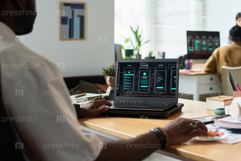 Черный человек разрабатывает интерфейс мобильных приложений на ноутбуке
