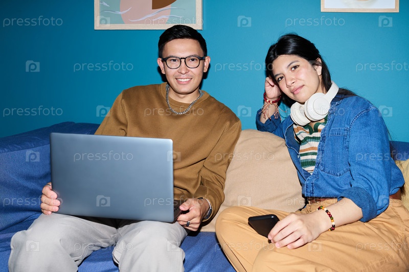 Портрет испаноязычного мужчины и женщины, использующих ноутбук и смартфон в помещении