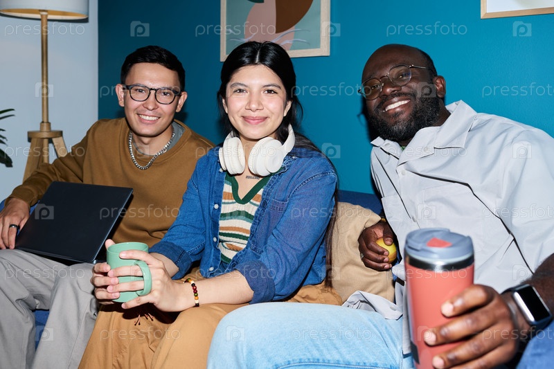 Мультиэтнические взрослые улыбаются и отдыхают вместе в помещении на диване