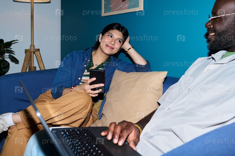 Испаноязычная женщина улыбается, разговаривая с черным мужчиной в помещении