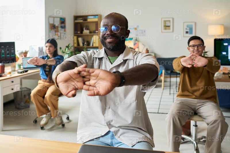 Чернокожий мужчина ведет разнообразных коллег по работе, растягиваясь в офисной обстановке