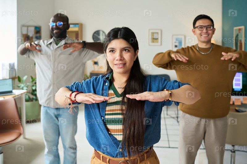 Мультиэтнические взрослые практикуют групповые упражнения в помещении вместе