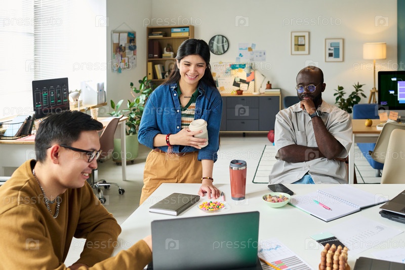 Мультиэтнические взрослые сотрудничают над проектом в современном офисном рабочем пространстве