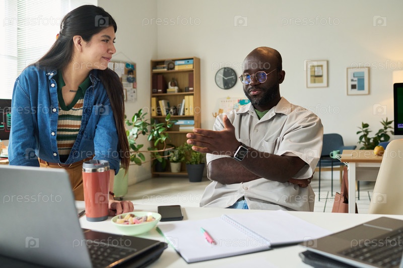 Женщина и чернокожий человек обсуждают проект в современном офисе