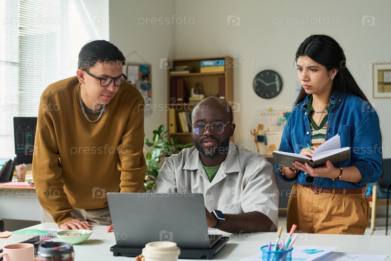 Мультиэтнические взрослые сотрудничают вокруг ноутбука во время офисной встречи