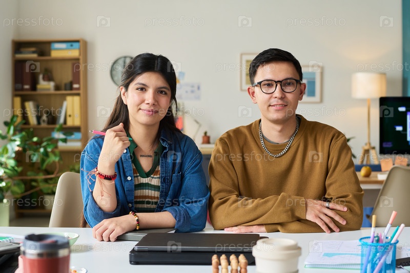 Портрет испаноязычной женщины и мужчины, сидящих вместе в офисе