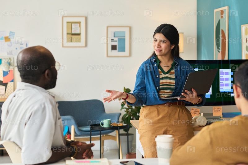Испанка объясняет проект различным коллегам в офисе