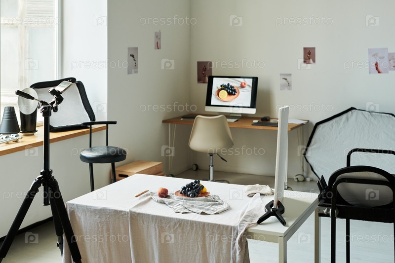 Интерьер студии с продуктовой фотографией, установка современной цифровой камеры