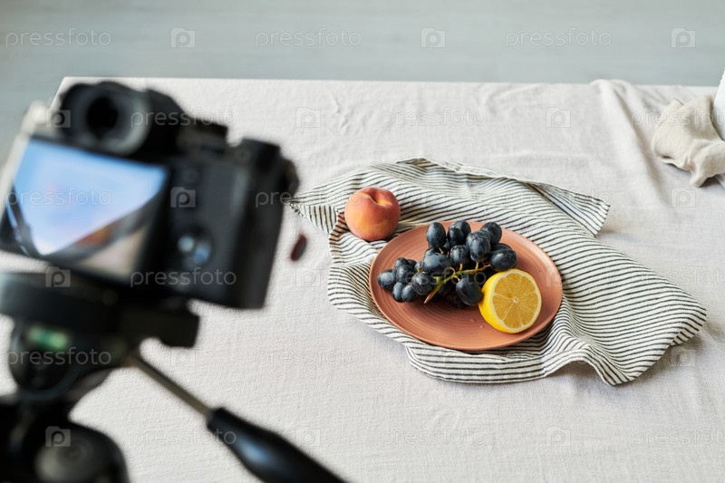 Цифровая камера фотографирует свежие виноградные лозы лимон и персик на скамейке