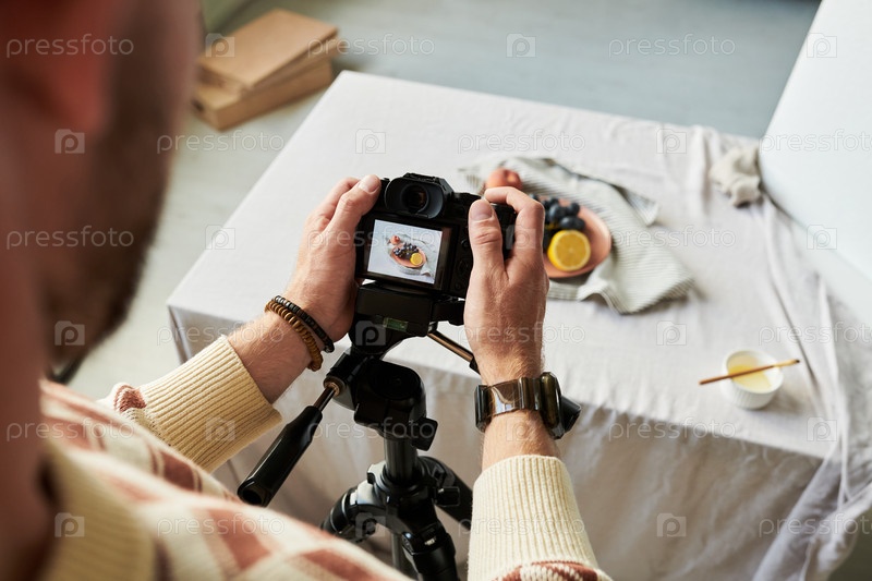 Мужчина фотографирует аранжировку еды с помощью цифровой камеры